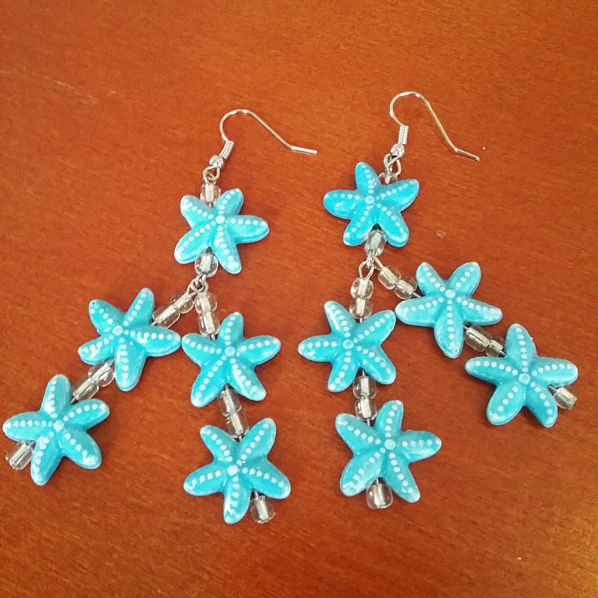 Earrings made with light blue ceramic beads in the shape of sea stars.