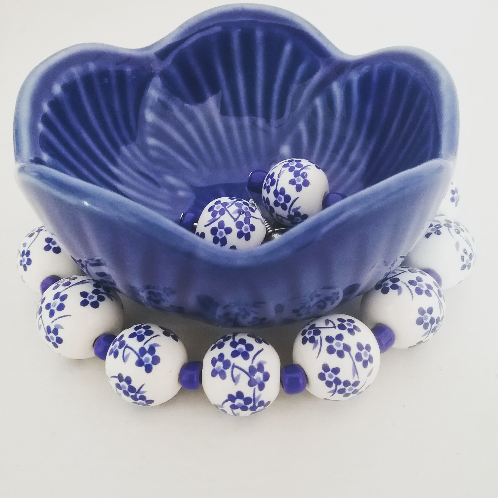 Hand-painted blue flowers on ceramic beads