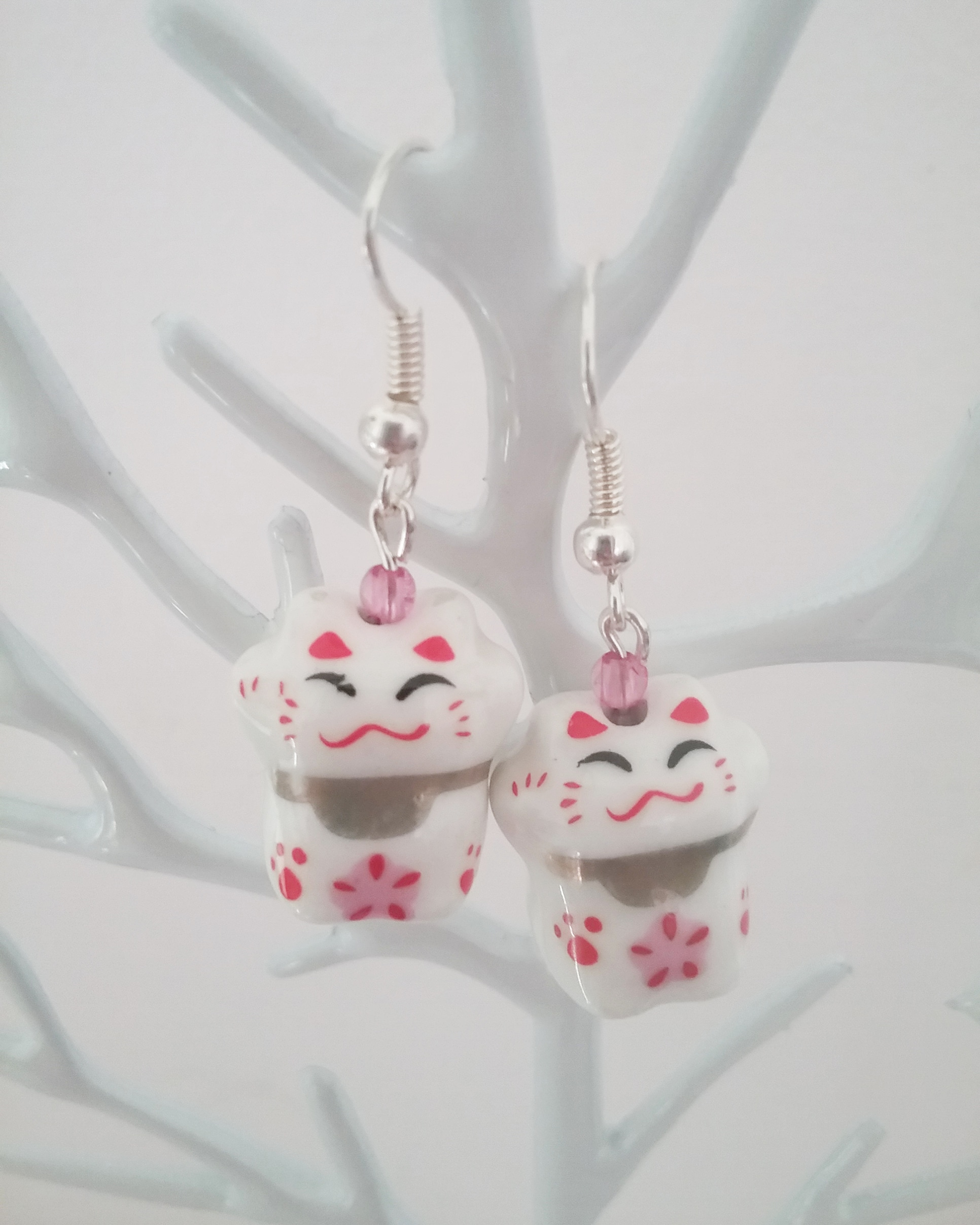 Earrings made of Japanese style ceramic painted cat beads.