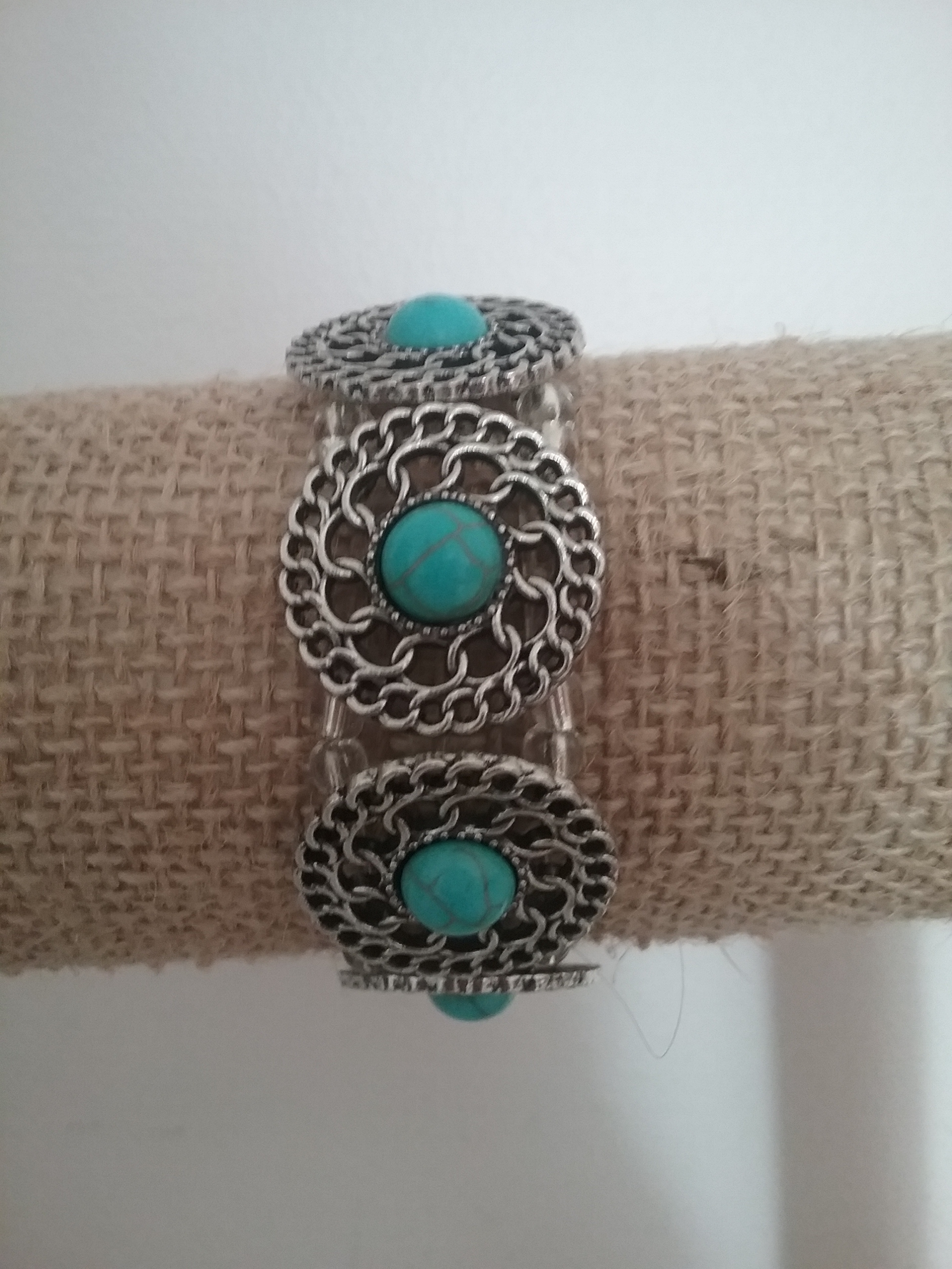 A bracelet made with turquoise-studded metal plates