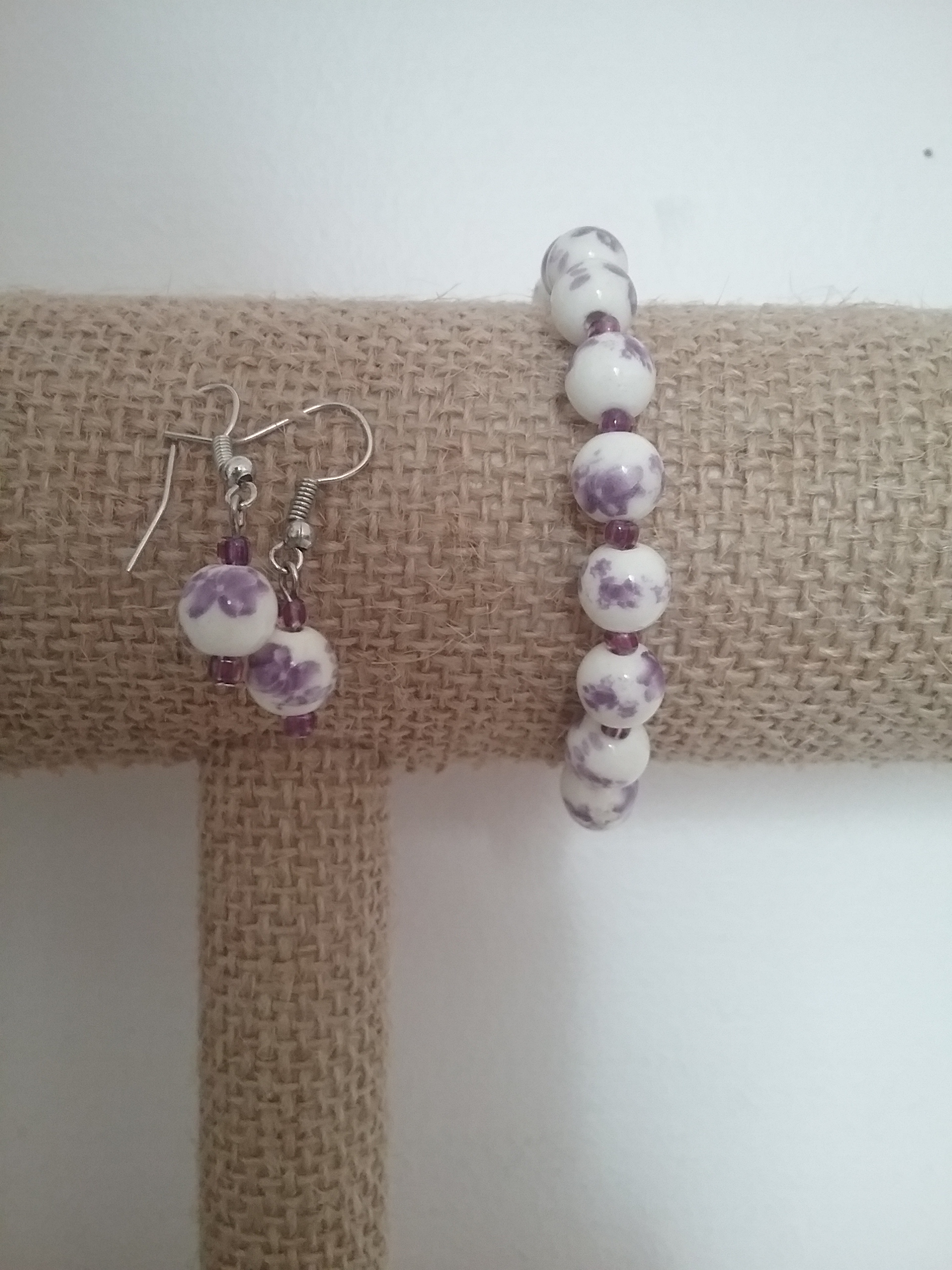 Ceramic beads with violet flowers painted on.