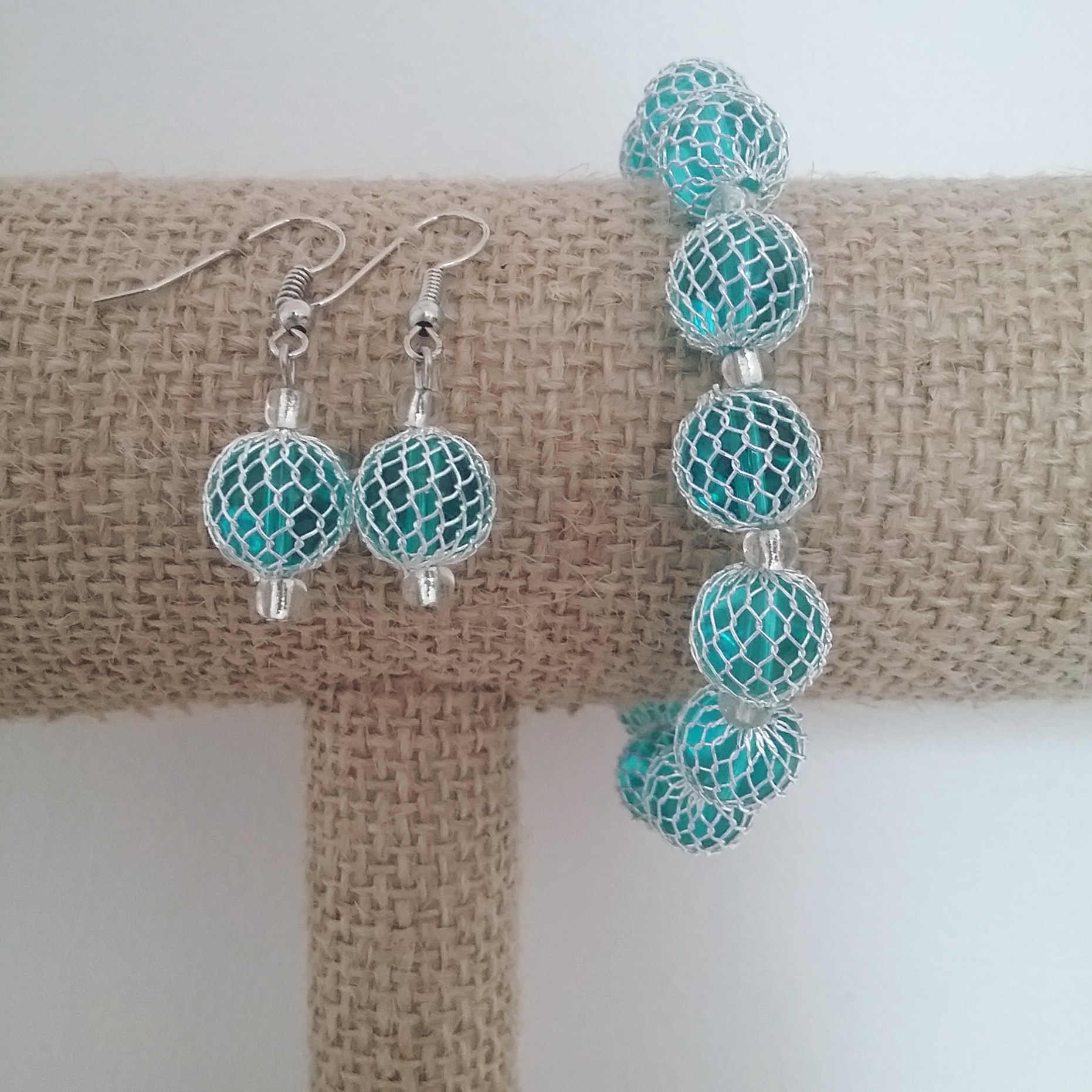 Blue glass beads with a wire weave.