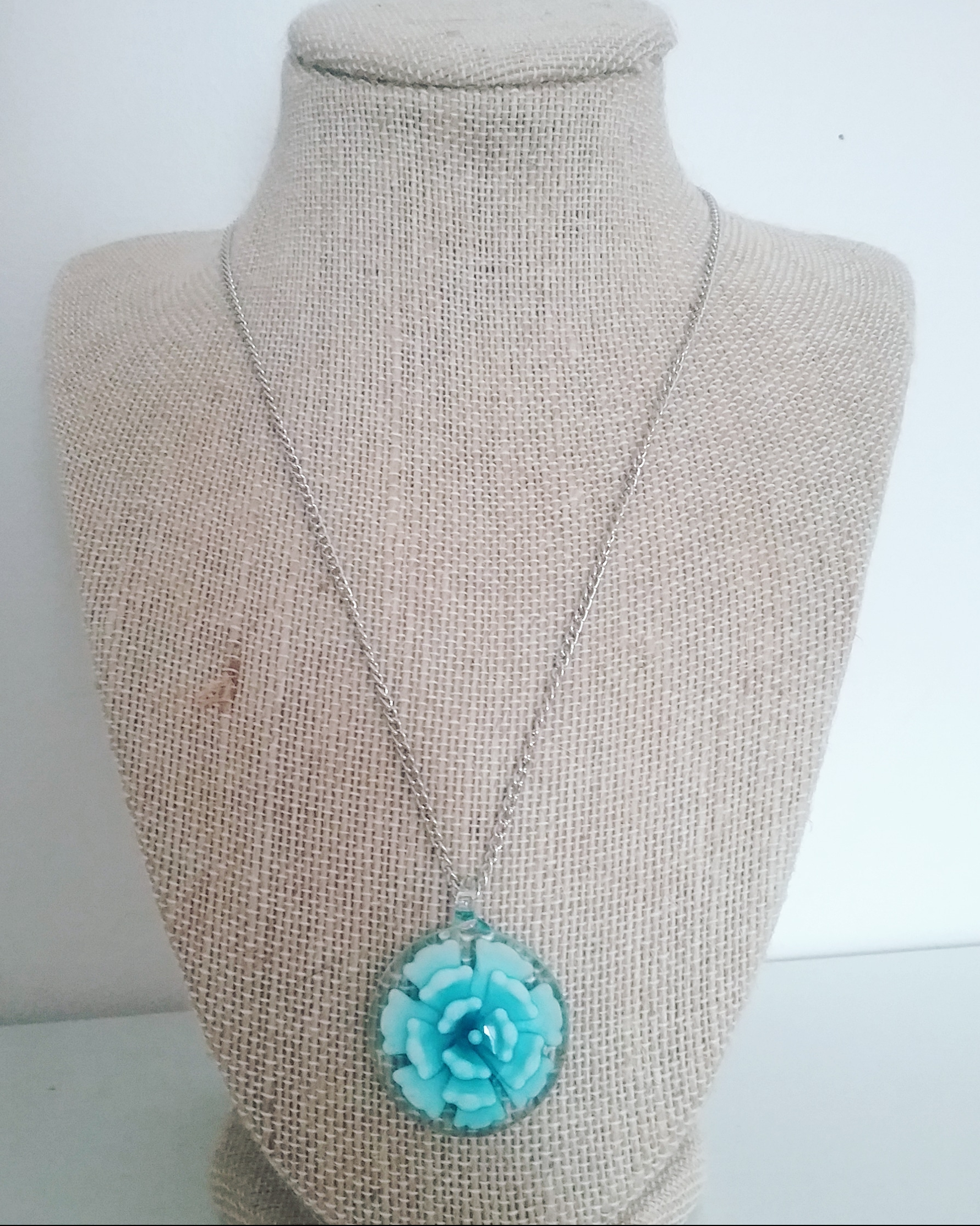 A chain necklace with a blown glass pendant with a turquoise flower inside.