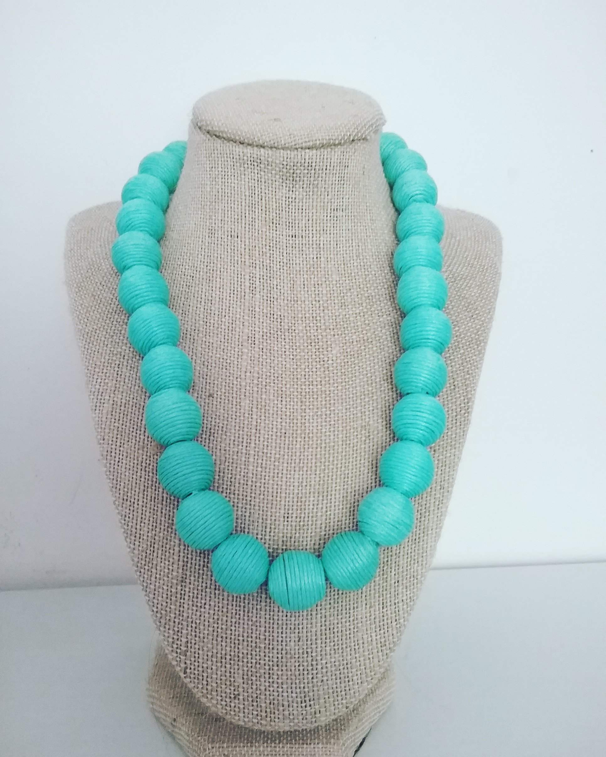 Made with wooden beads wrapped with turquoise cord, this necklace will remind you of lanterns in the garden.