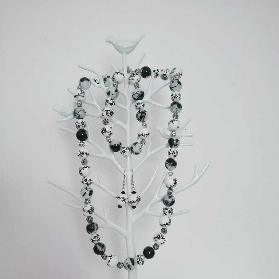 These cute black and white hand-painted ceramic and metal flower beads will WOW anyone! Perfect for the twilight hours in the long summer evenings! Each set includes an 18″ necklace, a bracelet, and a pair of earrings.