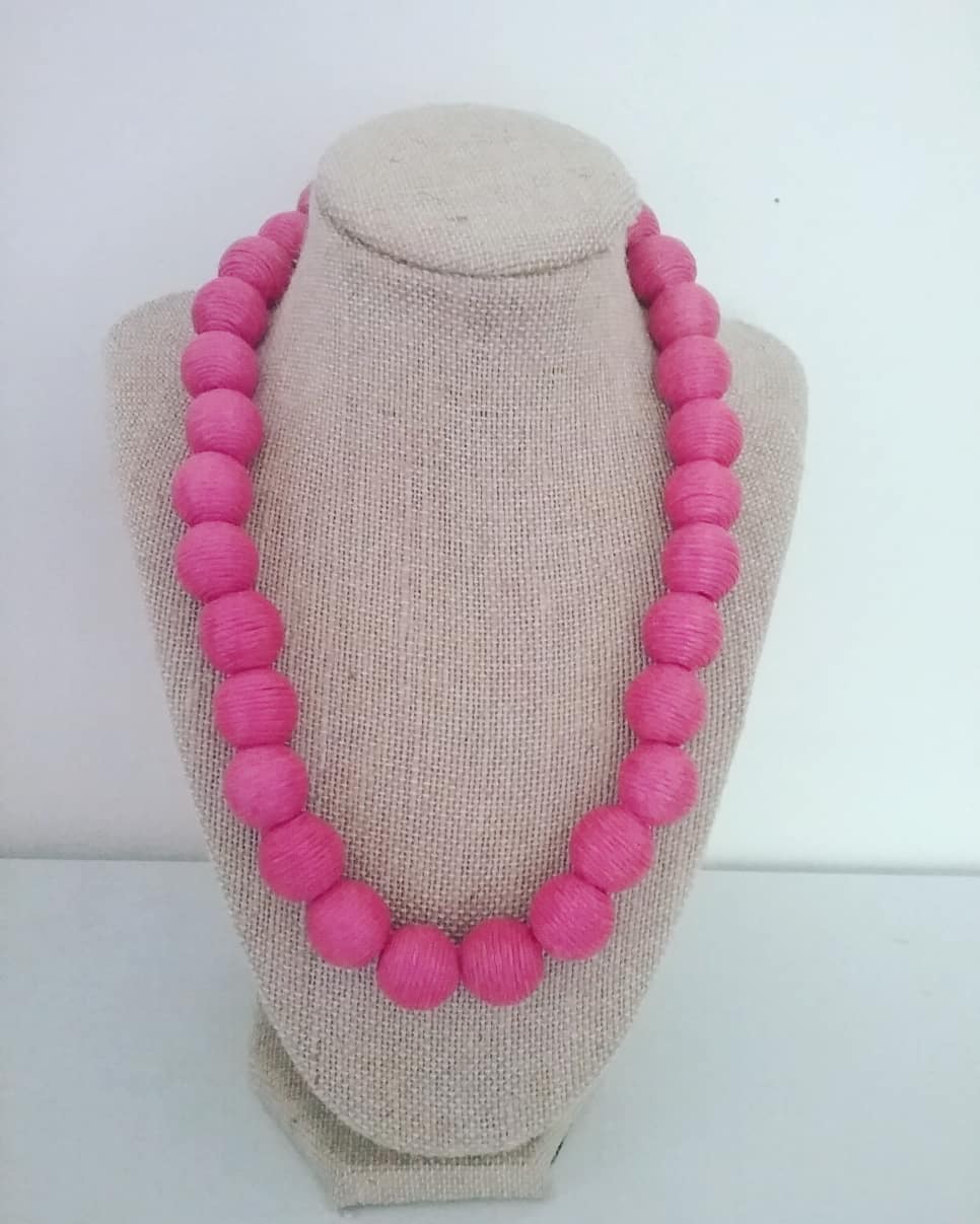 Made with wooden beads wrapped with hot pink cord, this necklace will remind you of lanterns in the garden.